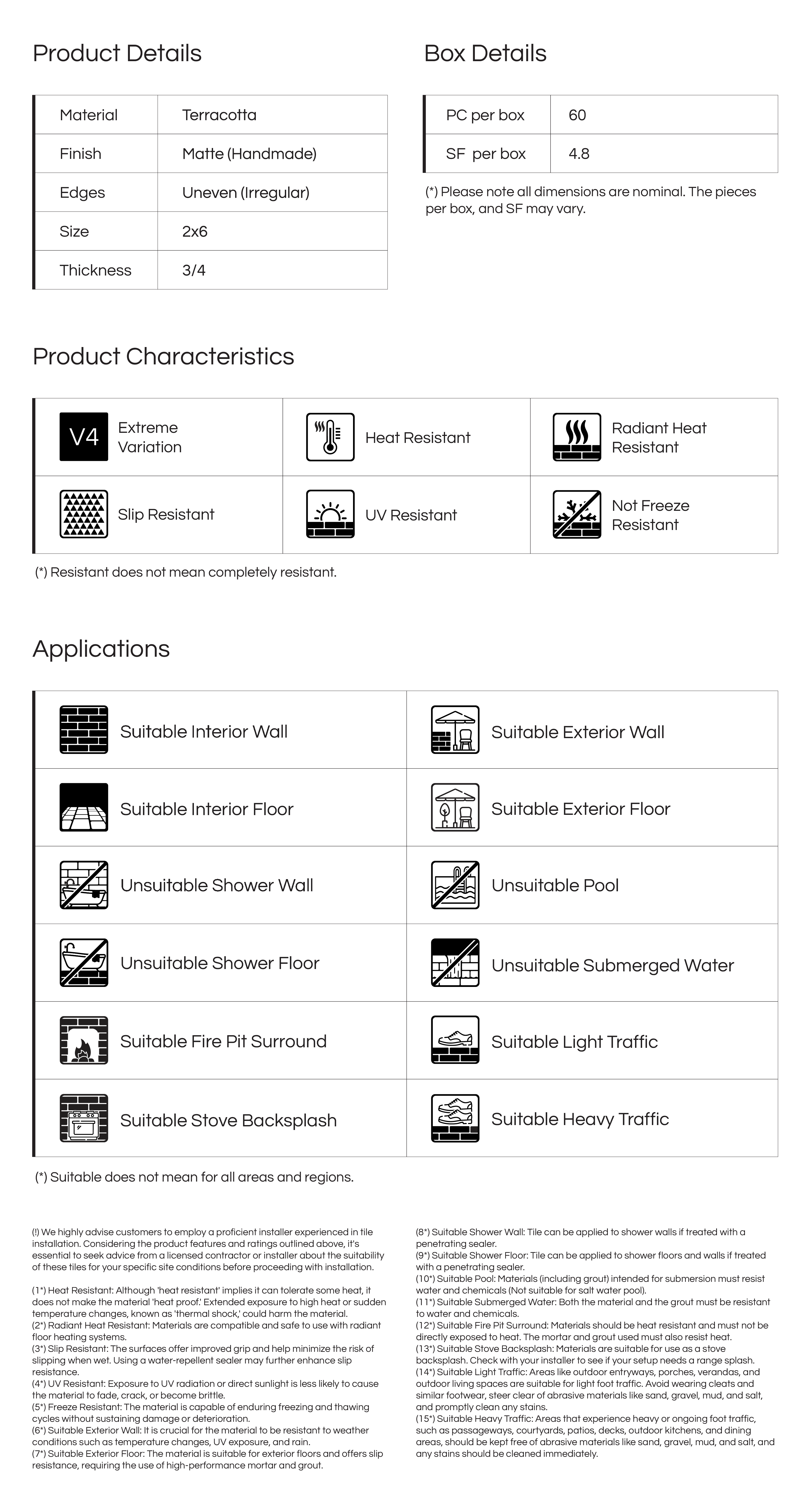 Size Variations: Due to the natural and handmade process of creating Terracotta tiles, slight differences in size can occur. This requires more skill during installation to maintain consistent grout lines.