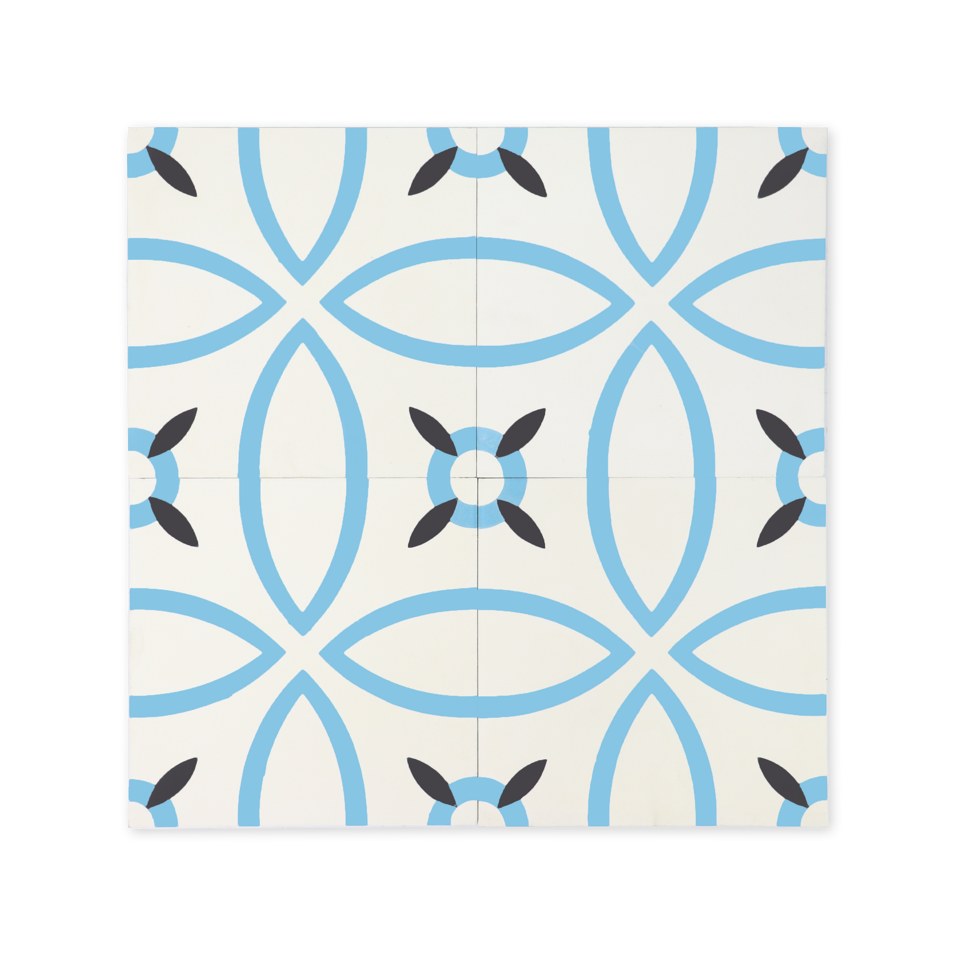 Turquoise, blue and black over white background. Four tiles together, show the circular pattern of this cement tile with a smaller circle flower in the center.