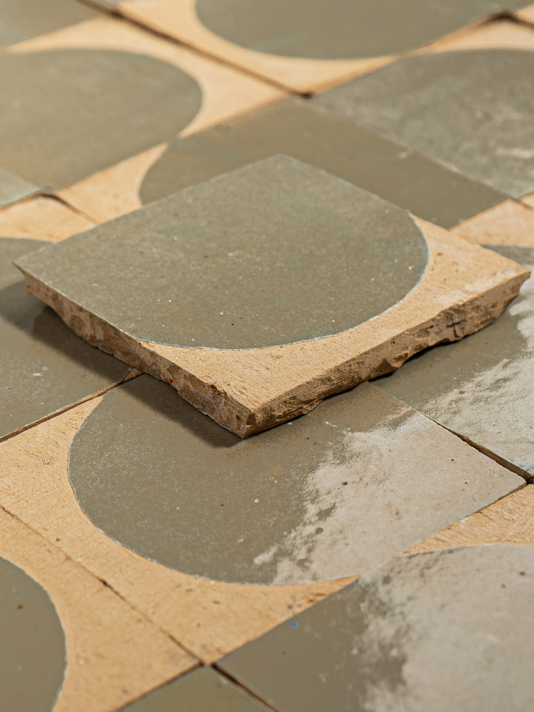 "Pebble Green" is a playful tile design inspired by the organic shapes and varied hues of river stones. The assortment of ovals in muted greens and deep blues are scattered on a creamy background like pebbles across a riverbed, each piece unique in its contours.